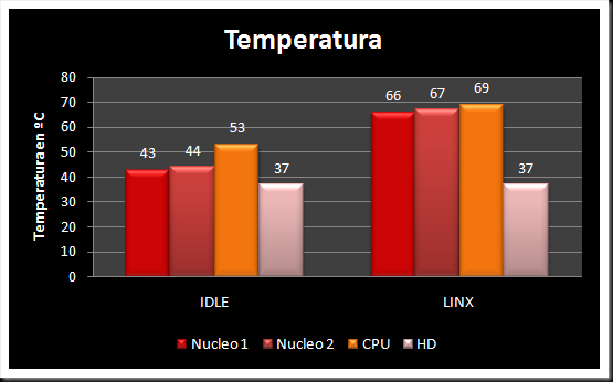 La medida de las temperaturas en IDLE se hicieron después de estar navegando por internet durante media hora, y las medidas ejecutando Linx tras 25 minutos de estrés.